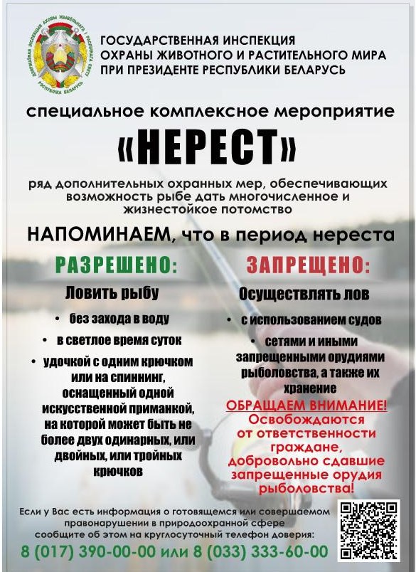 В связи с общим весенним запретом Государственной инспекцией охраны животного и растительного мира при Президенте Республики Беларусь в период с 16 марта по 8 июня 2025 года на территории Гродненской области проводится специальное комплексное мероприятие «Нерест», основными задачами которого определены: